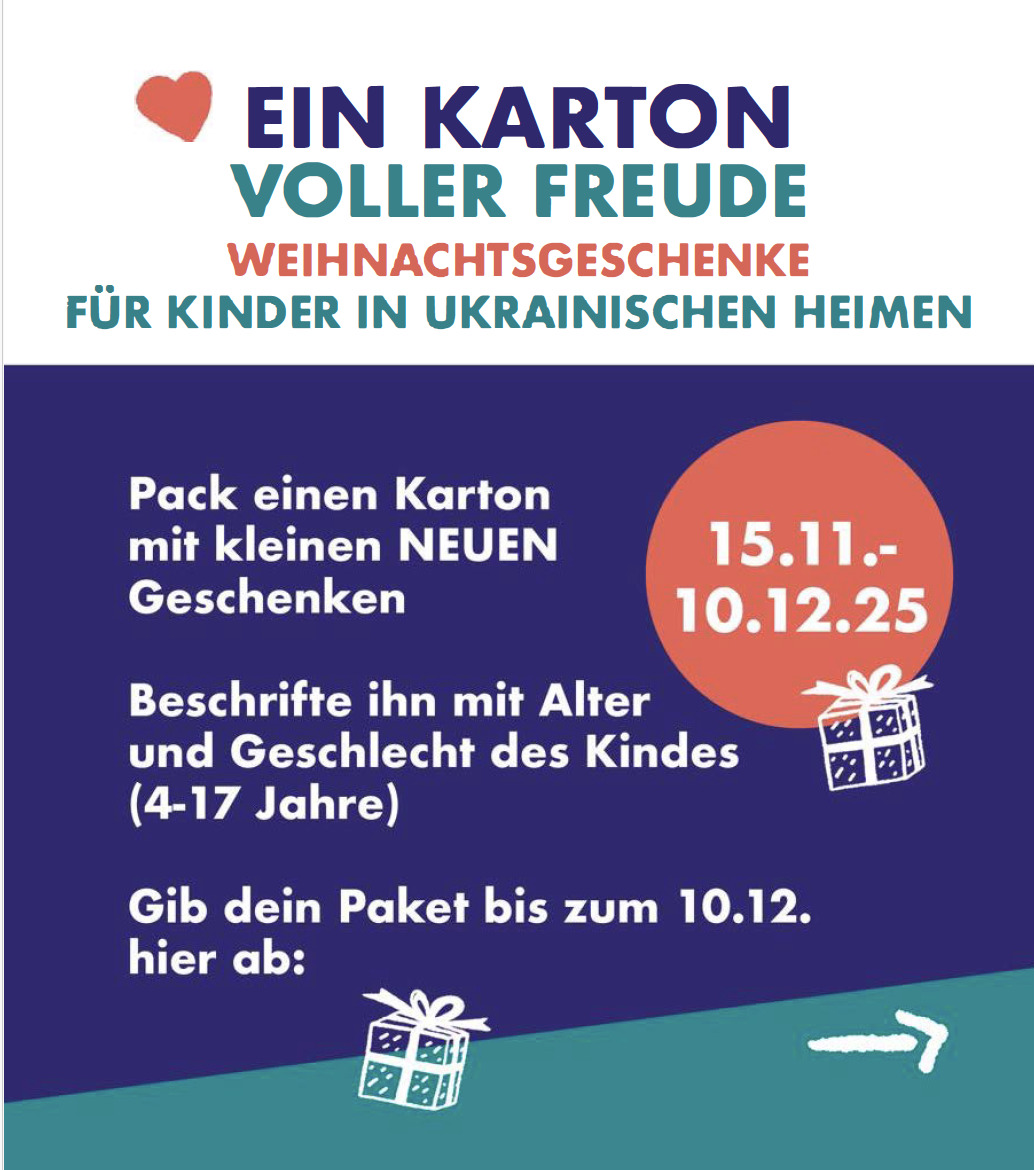 Cologne Cares e.V. sammelt: Ein Karton voller Freude! Weihnachtsgeschenke für Kinder in ukrainischen Heimen 15. November - 10. Dezember 2025 Pack einen Karton mit kleinen, neuen Geschenken. Beschrifte ihn mit Alter und Geschlecht des Kindes (4-17 Jahre) Jedes Geschenk zeigt: Du bist nicht vergessen! Gib dein Paket bis zum 10.12. hier ab: Ev. Kirchengemeinde Köln-Nippes Weiterlesen