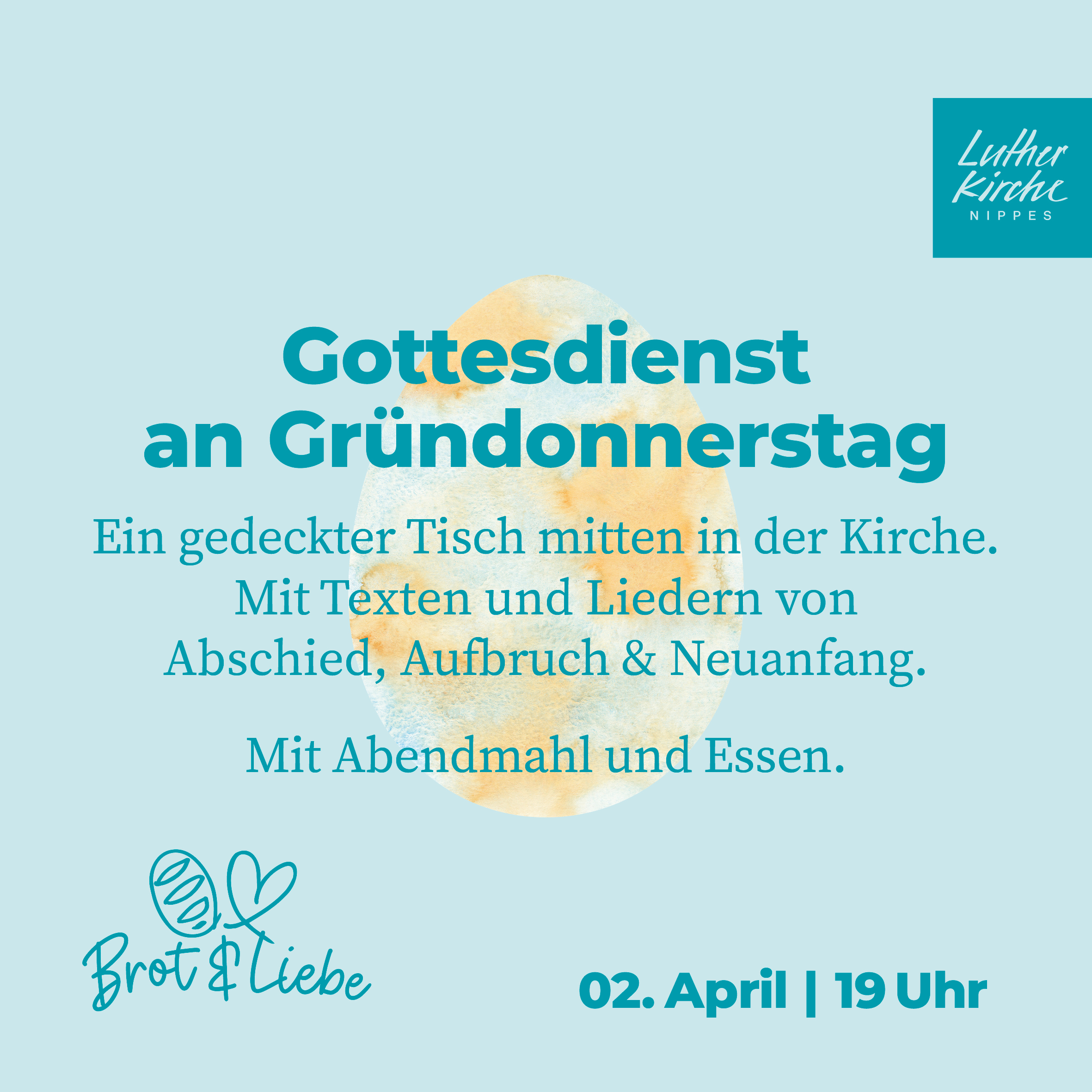 Lutherkirche Nippes Siebachstraße 85, Köln, NRW, Deutschland🥖 Brot & Liebe Ein gedeckter Tisch mitten in der Kirche.Gottesdienst mit gemeinsamem Essen.Wir sind eingeladen: Von alten und neuen Erfahrungen zu hören, von Abschied, Aufbruch und Neuanfang. Mit den Pfarrerinnen Dorit Felsch und Miriam Haseleu 📅 Donnerstag, 02. April 2026 ⏰ 19 Uhr 📍 Lutherkirche Nippes Online spenden Spenden für unsere Kollektenzwecke funktioniert auch Weiterlesen