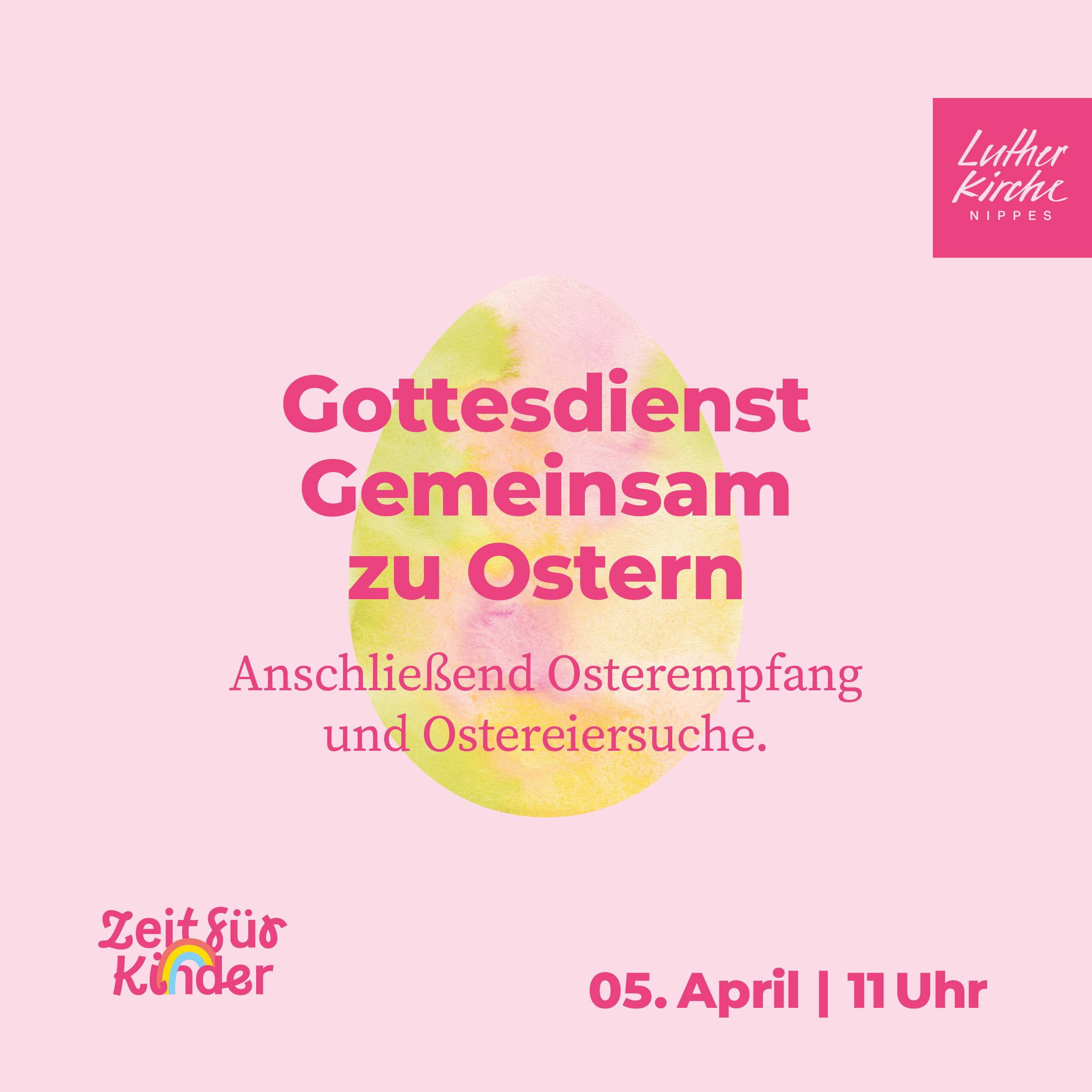 Lutherkirche Nippes Siebachstraße 85, Köln, NRW, Deutschland🐣 Gottesdienst Gemeinsam am Ostersonntag Wir feiern gemeinsam das Osterfest. Das Leben wird neu! Anschließend Empfang und Ostereiersuche im Kirchgarten. Musik: Kristina Brodersen (Saxophon), Tobias Weindorf (Klavier) Mit Pfarrerin Miriam Haseleu & Mia Kamps 📅 Sonntag, 05. April 2026 ⏰ 11 Uhr 📍 Lutherkirche Nippes Online spenden Spenden für unsere Kollektenzwecke funktioniert auch per Überweisung. Weiterlesen