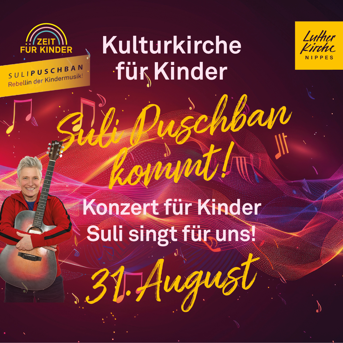 Gemeindehaus Siebachstr. 85, KölnDie Kulturkirche für Kinder präsentiert Suli singt für uns! ab 17 Uhr Konzert für Kinder Suli Puschban. Sie ist ein Phänomen. Ein Unikat in der Musiklandschaft.Charmant, witzig, tiefgründig – die Weiterlesen