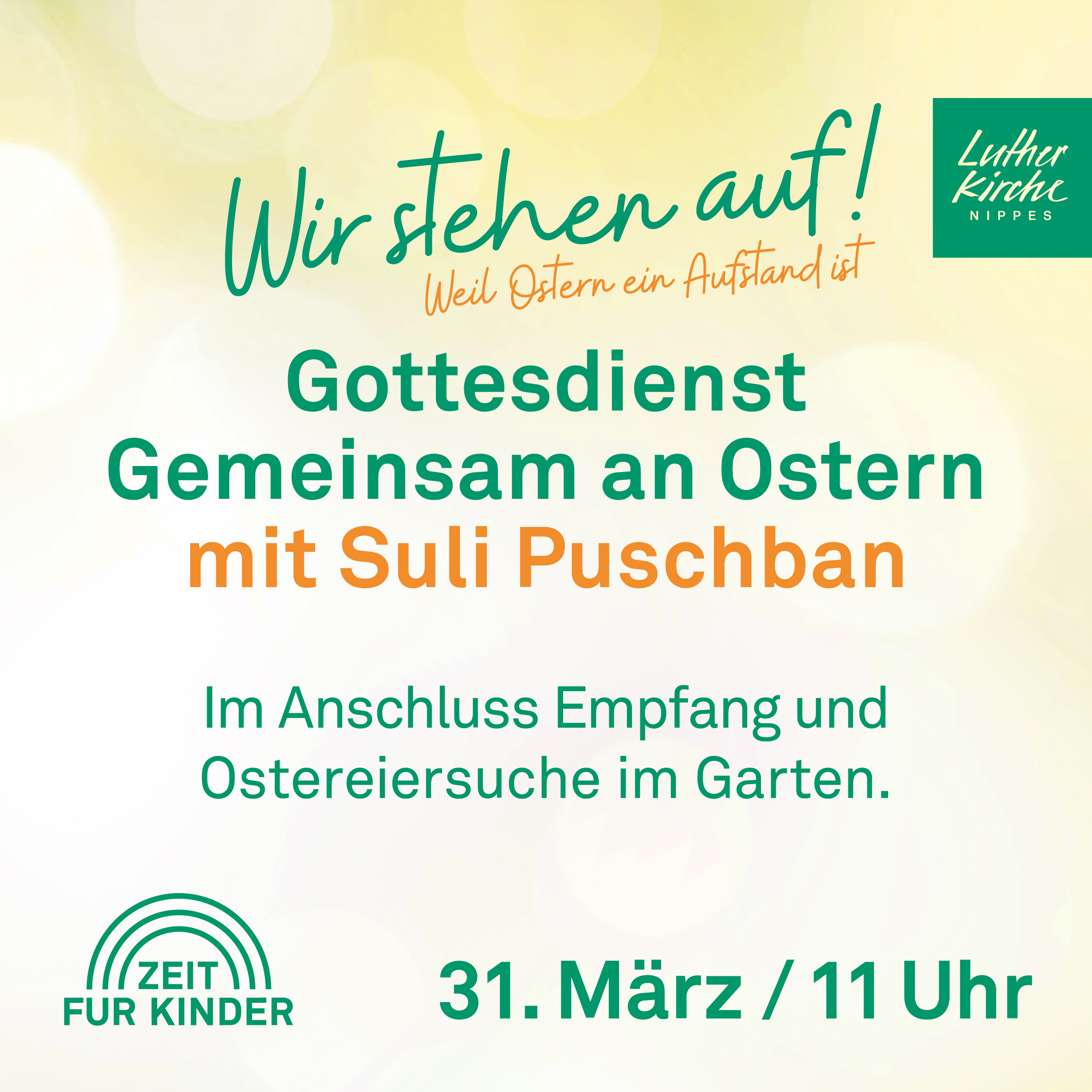 Lutherkirche Nippes Siebachstraße 85, Köln, NRW, DeutschlandWir stehen auf - Gottesdienst Gemeinsam an Ostern mit Suli Puschban. Weil Ostern ein Aufstand ist! Wir feiern Ostern mit Suli Puschban, der Rebellin der Kindermusik. Der Hase Frederico und Weiterlesen
