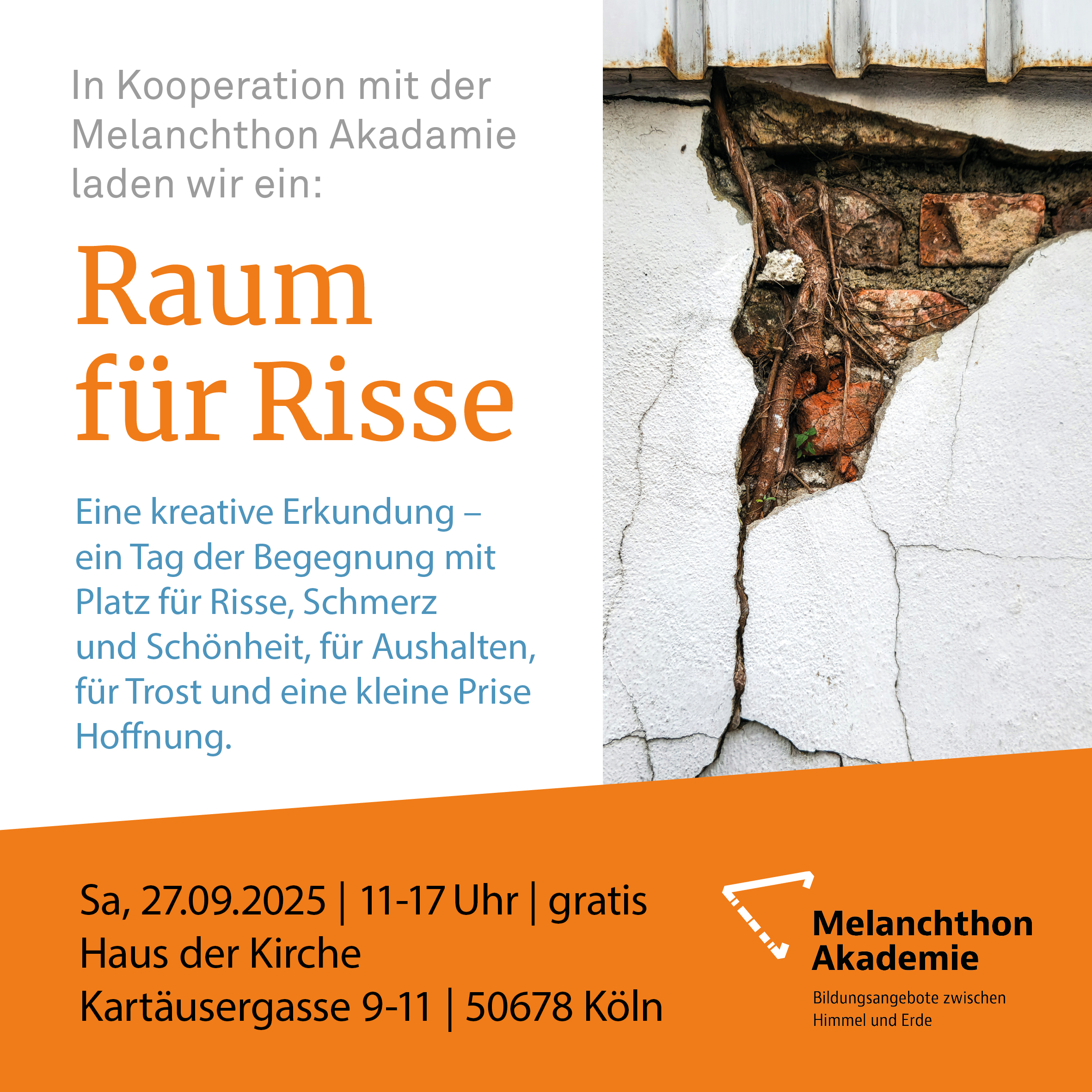 Melanchthon Akademie Kartäusergasse 7, Köln, DeutschlandKreativer Erkundungstag in der Kartäuserkirche – mit Dorothee Schaper, Lena Felde, Lea Braun, Dr. Dorit Felsch und Miriam Haseleu: "Raum für Risse" Sa, 27. September | 11-17 Uhr Haus der Evangelischen Kirche Kartäusergasse 9-11 Anmeldung Wir laden Sie ein zu einem Tag der Begegnung mit Platz für Risse, Schmerz und Schönheit, für Aushalten, für Weiterlesen