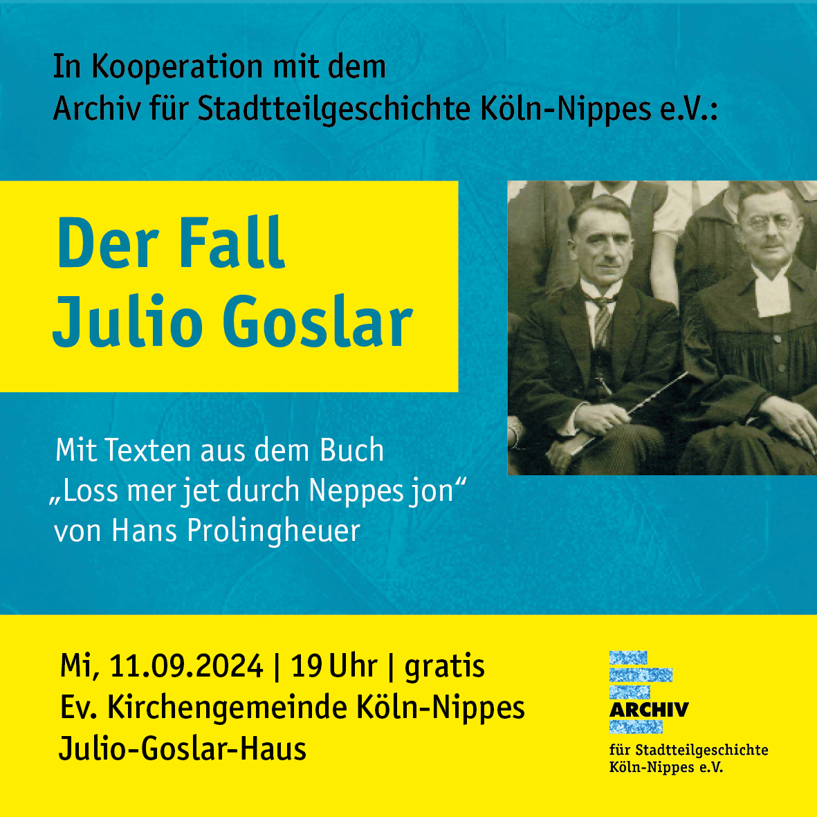 40 Jahre Archiv für Stadtteilgeschichte Köln-Nippes e.V.: "Der Fall Julio Goslar" Das beispielhafte Schicksal des rassistisch verfolgten Köln-Nippeser Musikdirektors Julio Goslar, der nach jahrelangen Schikanen am 22. Oktober 1936 seine Kündigung einreichte und im Versteck überlebte. Mit Texten aus dem Beitrag von Hans Prolingheuer in unserem vergriffenen Buch „Loss mer jet durch Neppes jon“. Moderation: Weiterlesen |