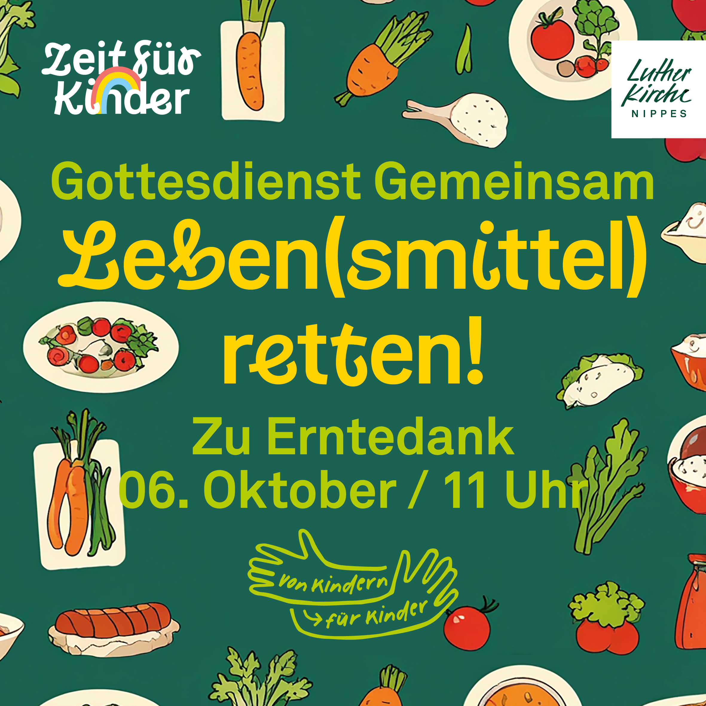 Leben(smittel) retten! Nach dem Gottesdienst Gemeinsam essen wir zusammen im Garten oder im Gemeindehaus. Wir freuen uns über mitgebrachte vegetarische Speisen zum Teilen, wie zum Beispiel Brot, Salate, Quiche, Oliven oder Kuchen. Eine Kürbissuppe wird von der Gemeinde vorbereitet. Gestaltet von Pfarrerin Dorothea Ugi & dem Team von Zeit für Kinder. Online spenden Spenden für Weiterlesen |