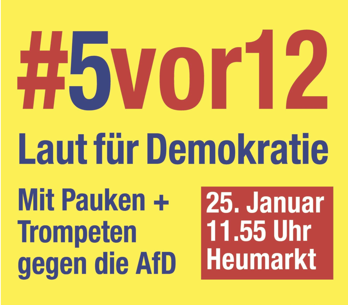 Demo gegen die AFD: #5vor12 - Laut für Demokratie! Mit Pauken und Trompeten, Trommeln, Blasinstrumenten, Trillerpfeifen, Kochtöpfen mit Löffeln, Rasseln, Klangstäben, Agogos, Glockenspielen und Tubas. Wir wollen so laut sein, dass ganz Köln es hört. Für ein demokratisches, soziales, klimagerechtes, vielfältiges, weltoffenes und friedliches Deutschland. Samstag 25. Januar 2025 11:55 Uhr | Heumarkt Wir rufen Weiterlesen |