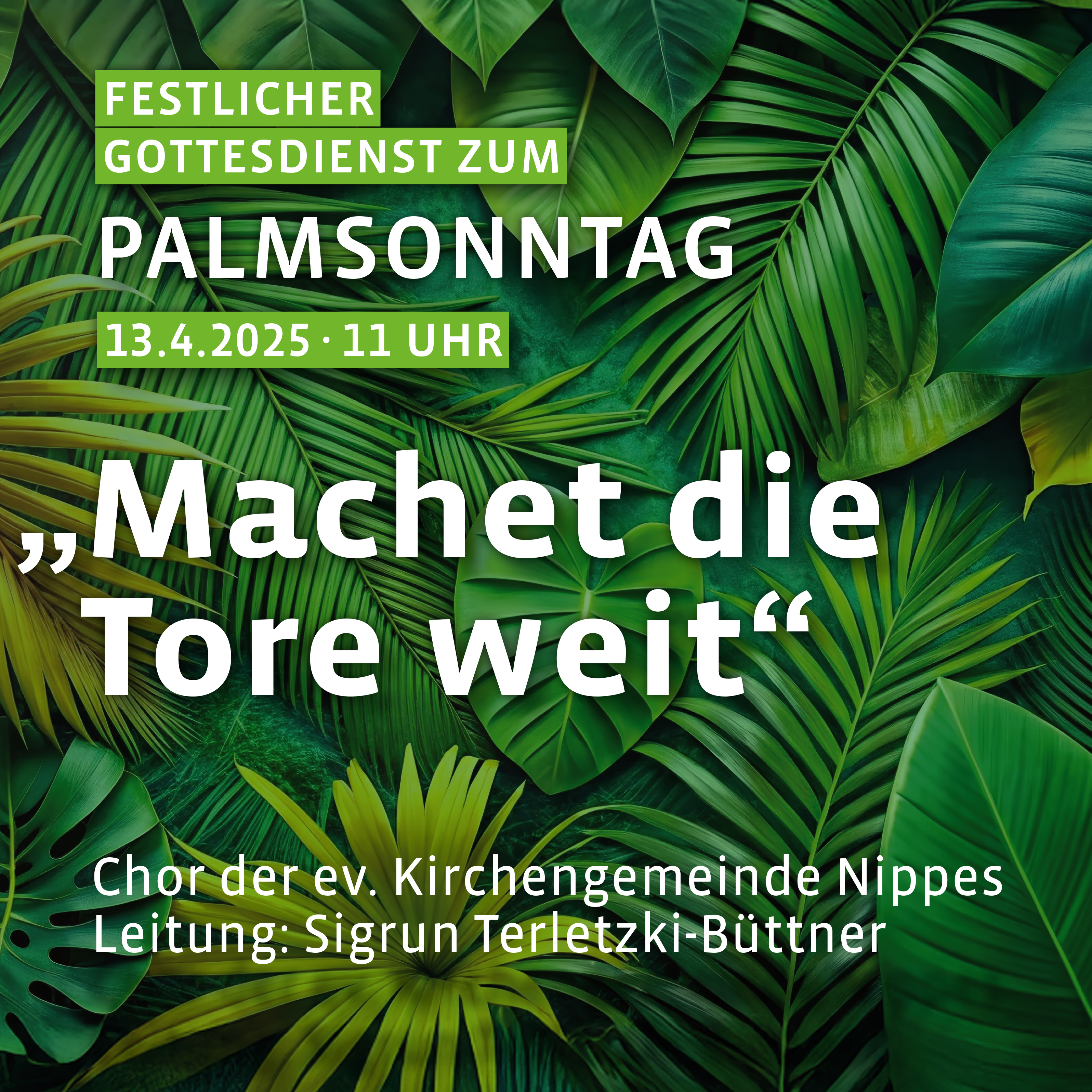 Machet die Tore weit! Festlicher Gottesdienst mit zahlreichen musikalischen Werken unterschiedlicher Epochen zum Palmsonntag. Mit Pfarrerin Dorothea Ugi und dem Gemeindechor (Leitung: Sigrun Terletzki) Online spenden Spenden für unsere Kollektenzwecke funktioniert auch per Überweisung. Unsere Kontodaten finden Sie im Bereich Spenden. Vielen Dank für Ihre Unterstützung!
