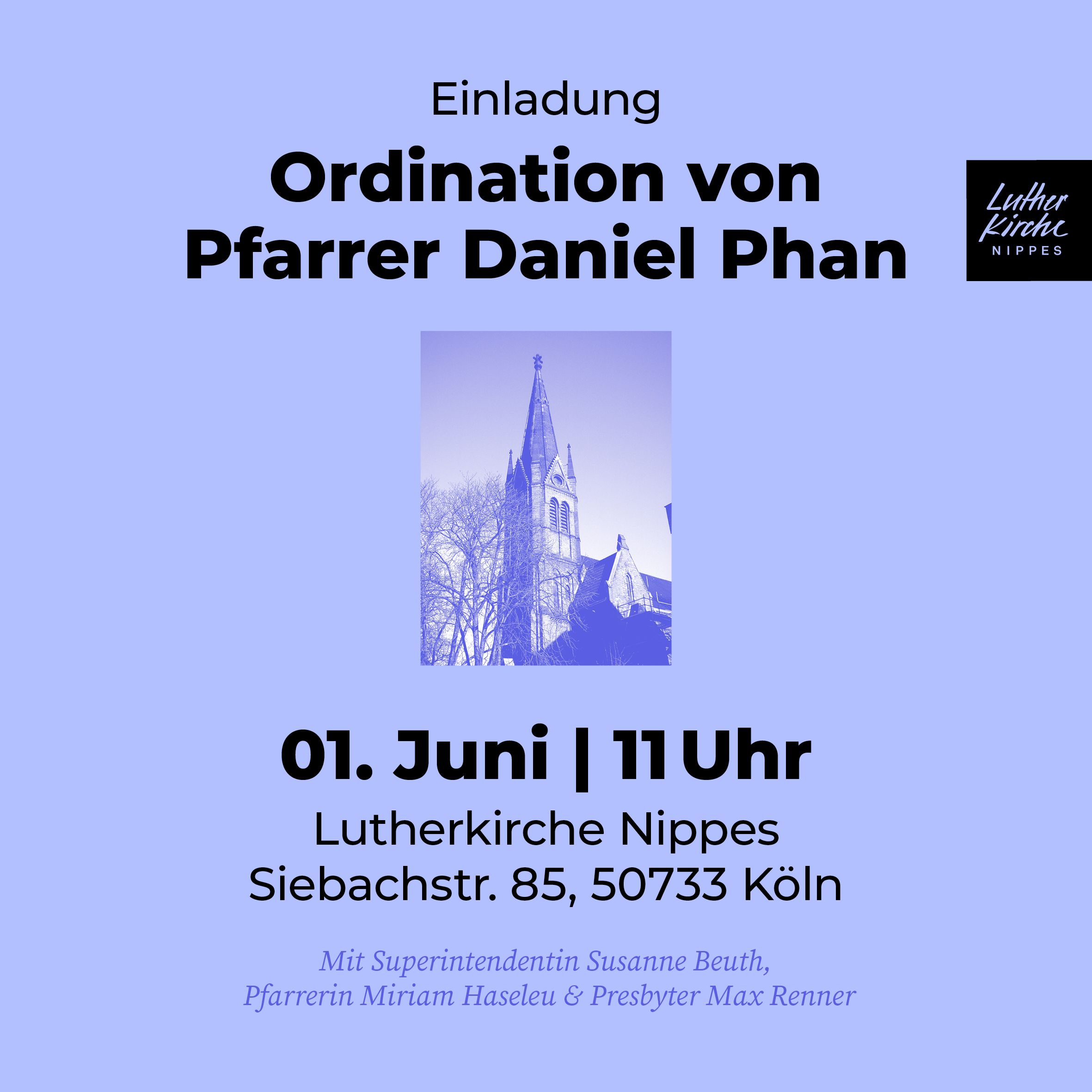 Der Gottesdienst zur Ordination von Pfarrer Daniel Phan mit Superintendentin Susanne Beuth, Pfarrerin Miriam Haseleu und Presbyter Max Renner. Online spenden Spenden für unsere Kollektenzwecke funktioniert auch per Überweisung. Unsere Kontodaten finden Sie im Bereich Spenden. Vielen Dank für Ihre Unterstützung! |